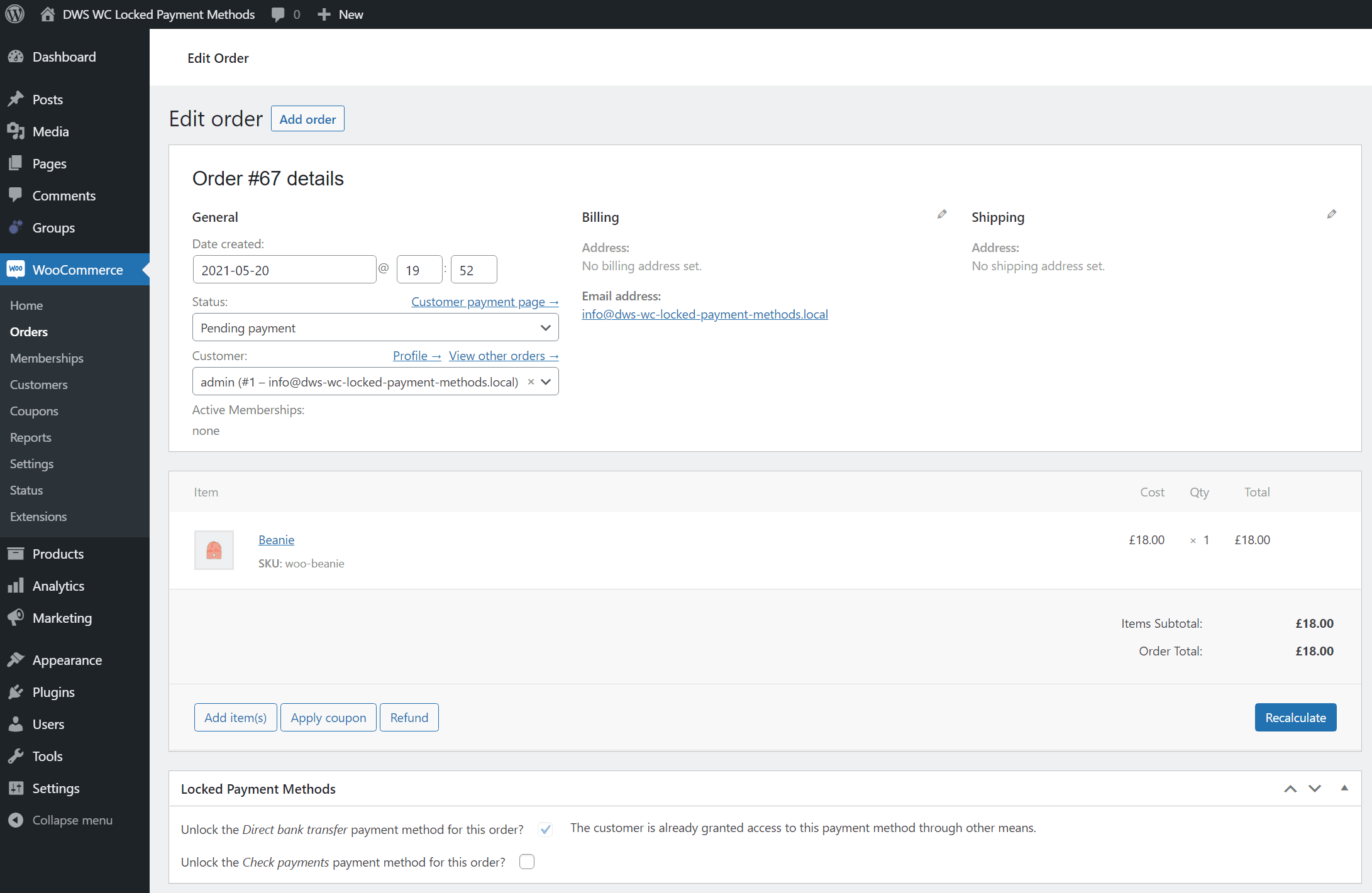 With the unlocking strategy active you can now find a new metabox on the Edit order screen. The metabox is aptly named Locked Payment Methods and provides you with checkboxes to allow the customer to pay for the given order using normally locked payment methods.
